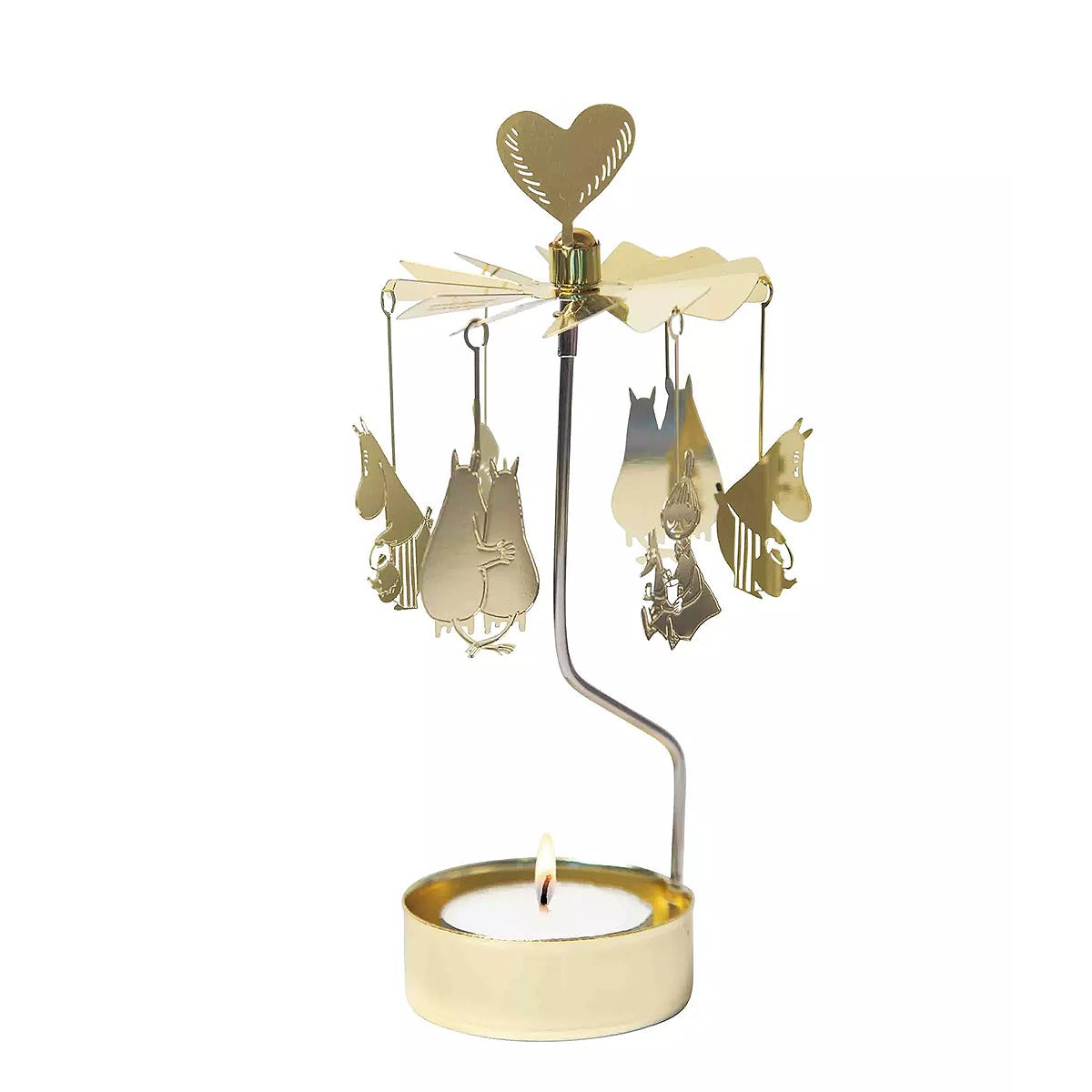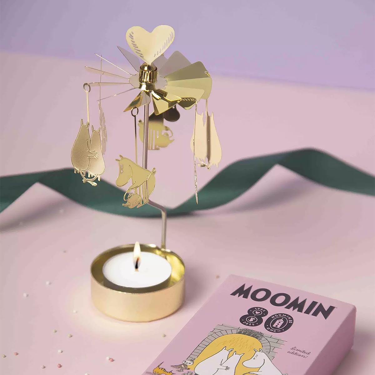 Celebrate 80 magical years of Moomin with Pluto’s Moomin angel chime rotary candleholder. This charming tealight holder features your favourite Moomin characters in a golden finish, twirling gracefully as the candlelight dances around them. Simply light the included tealight and watch the Moomins gently turn.