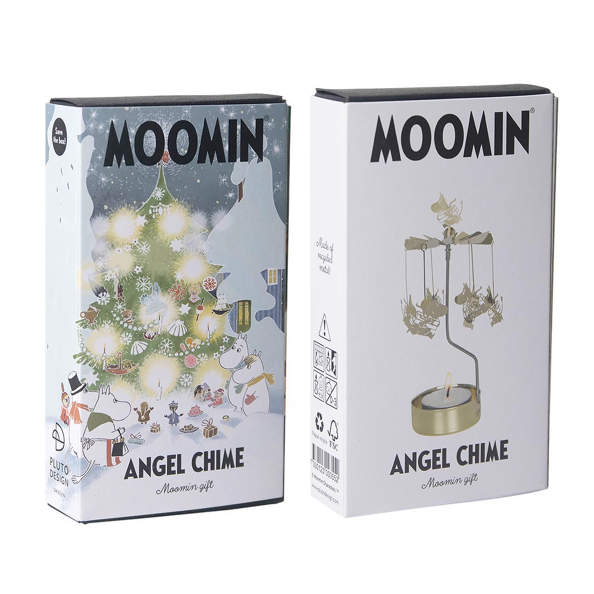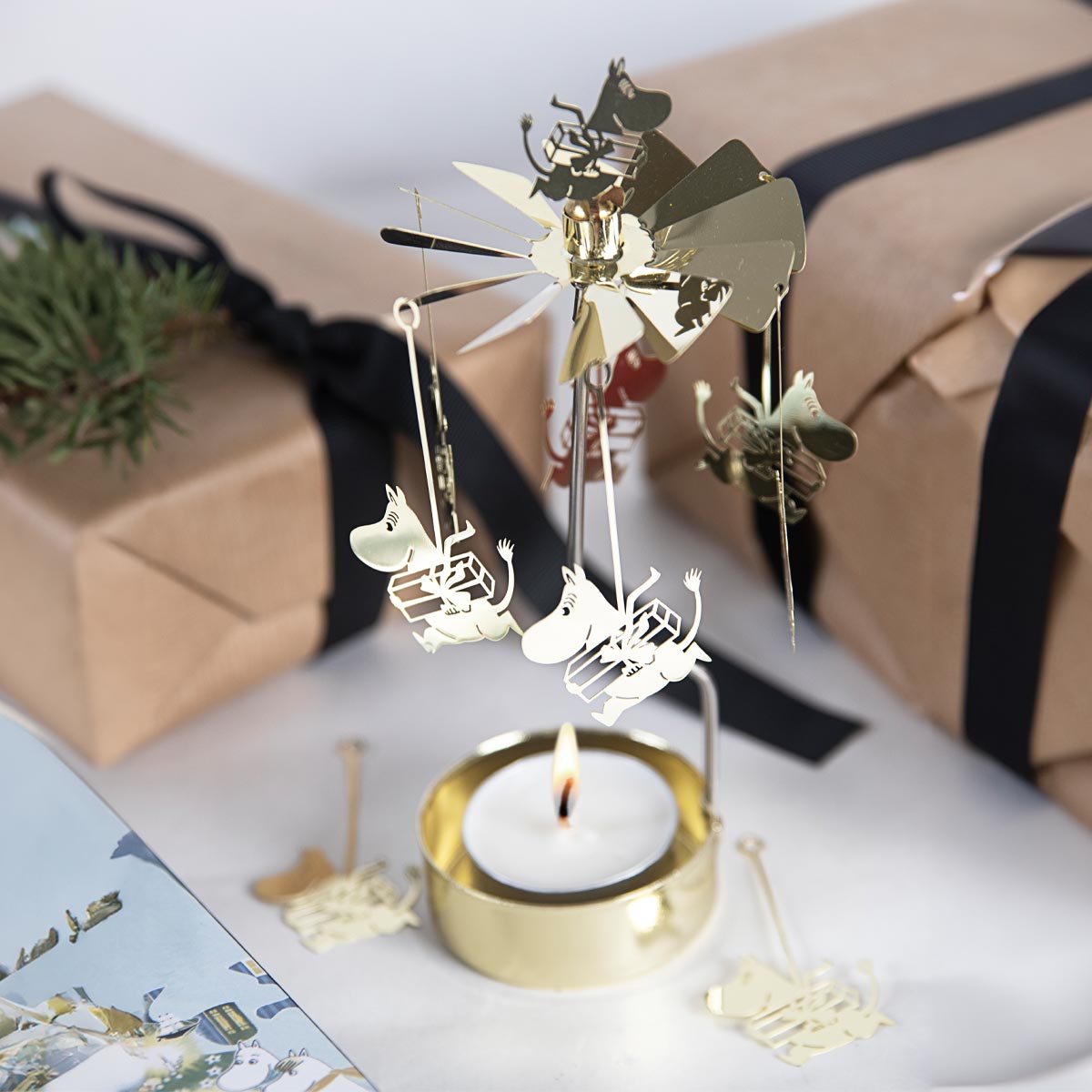 Pluto’s Moomin Gifts angel chime rotary candleholder shines in gold and features the beloved Moomin holding a present. Simply light the included tealight and watch as the golden figures twirl gracefully, casting a warm glow and playful reflections.