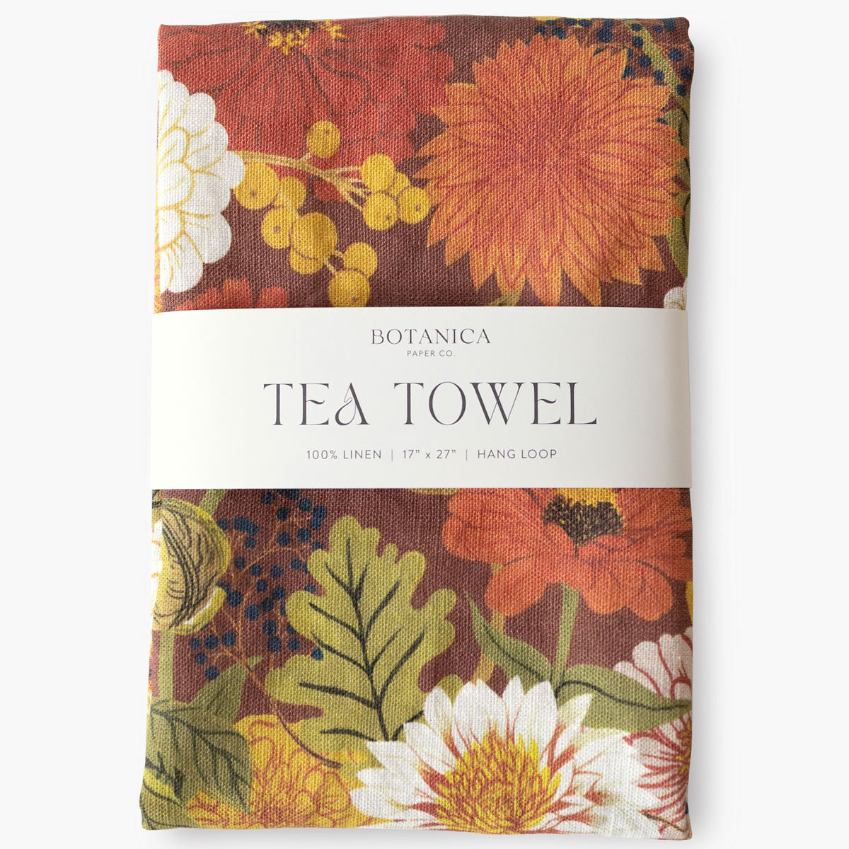 Designed by Oana Befort, this exquisite 100% European linen tea towel brings the warmth and beauty of autumn into your home. Adorned with a rich tapestry of autumn flowers, vibrant foliage, and earthy hues, it captures the season's essence in every detail. Printed with non-toxic inks, its intricate design adds a cosy charm to any kitchen—perfect for drying dishes, enhancing your décor, or simply appreciating its beauty.