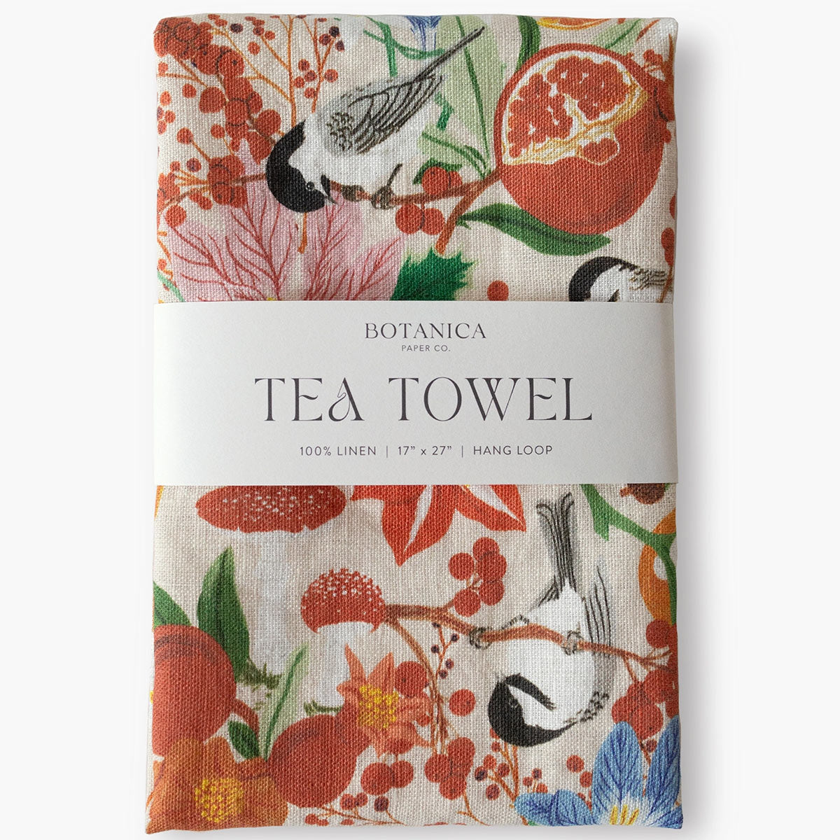 Designed by Oana Befort, this exquisite 100% European linen tea towel brings a touch of nature into your home. Adorned with elegant birds, striking blooms, and juicy pomegranates, its intricate design celebrates the beauty of the season. Printed with non-toxic inks, it adds warmth and charm to any kitchen—perfect for drying dishes or adding a refined decorative touch.