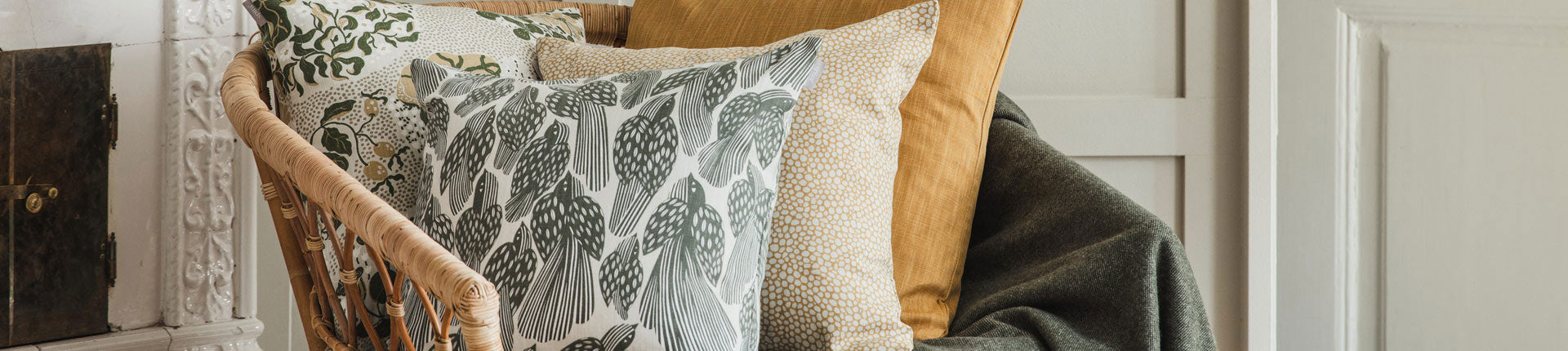 The gentle Dotte cushion features tiny linen-coloured pebbles on an almost black, asphalt background - a simple design that coordinates perfectly with Spira's many complementary cushions.