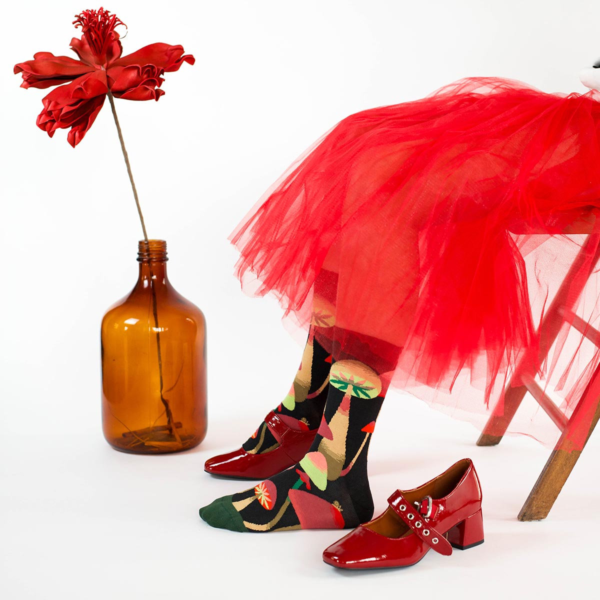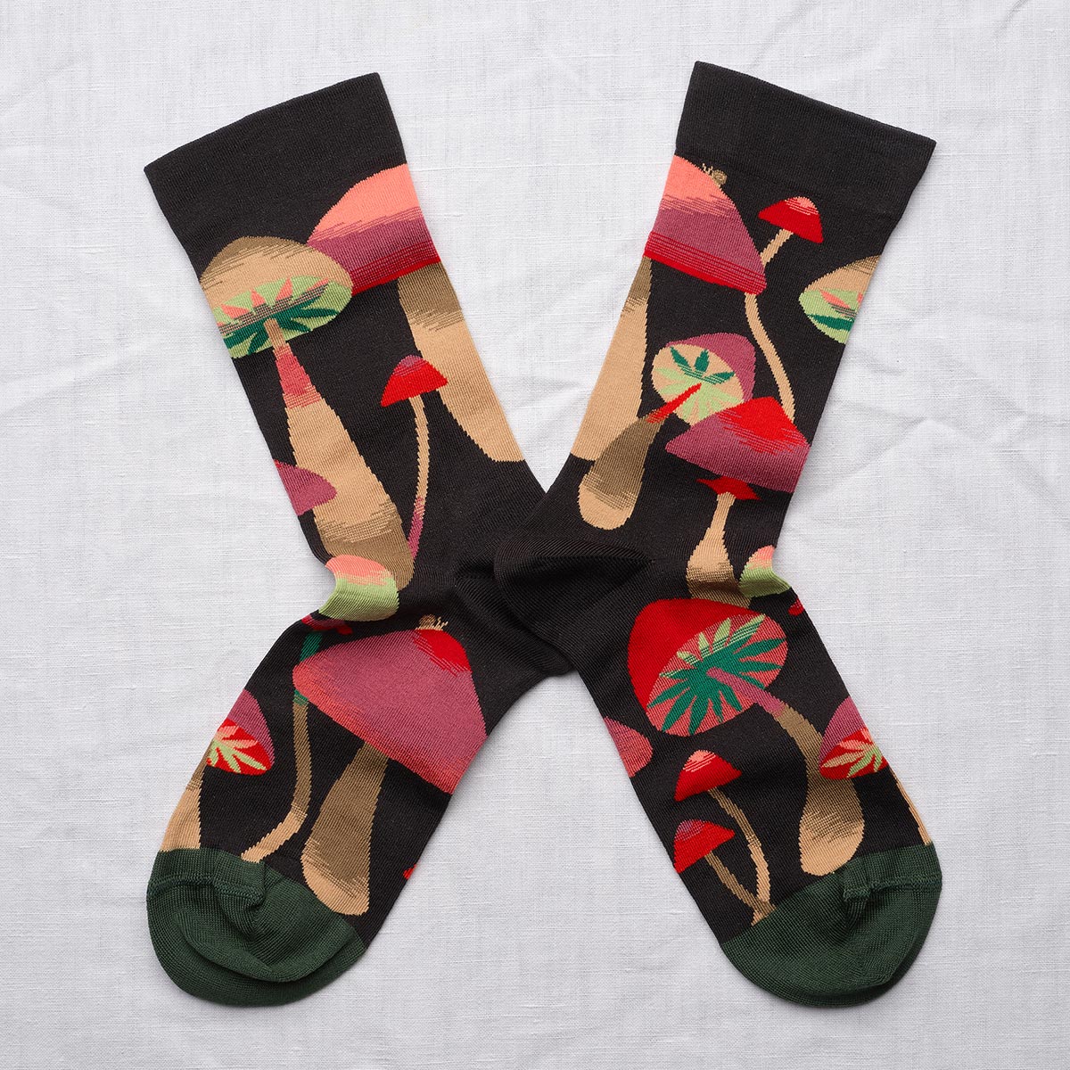 Bonne Maison’s False Black Mushroom socks bring a touch of woodland wonder to your wardrobe. Bold, graphic mushrooms pop against a sleek black background, creating a playful yet striking design that feels both modern and magical. Perfect for adding a dash of nature-inspired charm to everyday outfits.