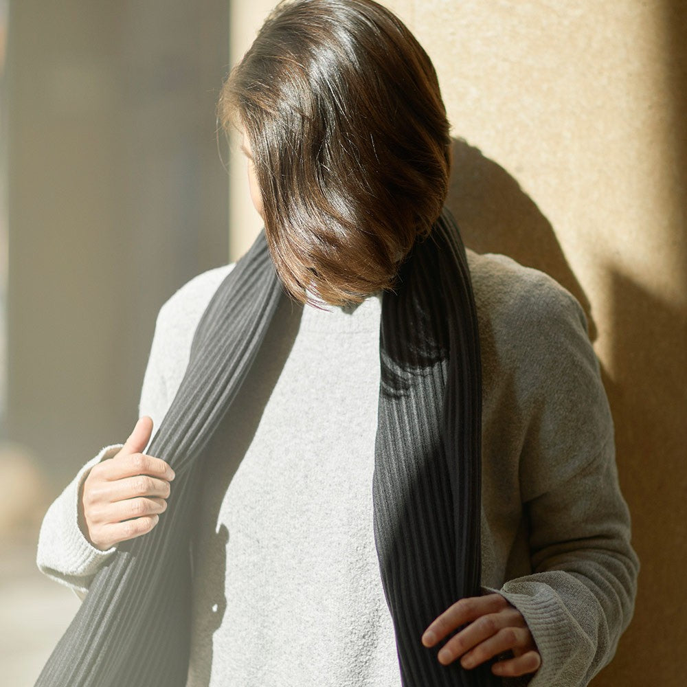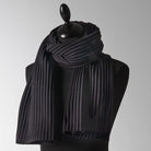 The short black Pleece scarf is ideal for anyone with a sensitivity to wool. It is lightweight, cosy to wear, and will keep you beautifully warm as the temperatures plummet.