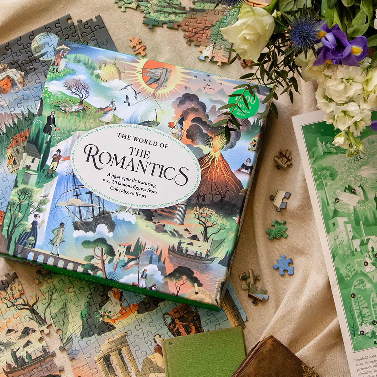 This intricately detailed 1000 piece jigsaw puzzle features famous poets, writers, artists, activists, musicians and scientists from the Romantic movement, including the Shelleys, Lord Byron, Keats, Coleridge, Wordsworth, Blake, Beethoven, Turner and more.
