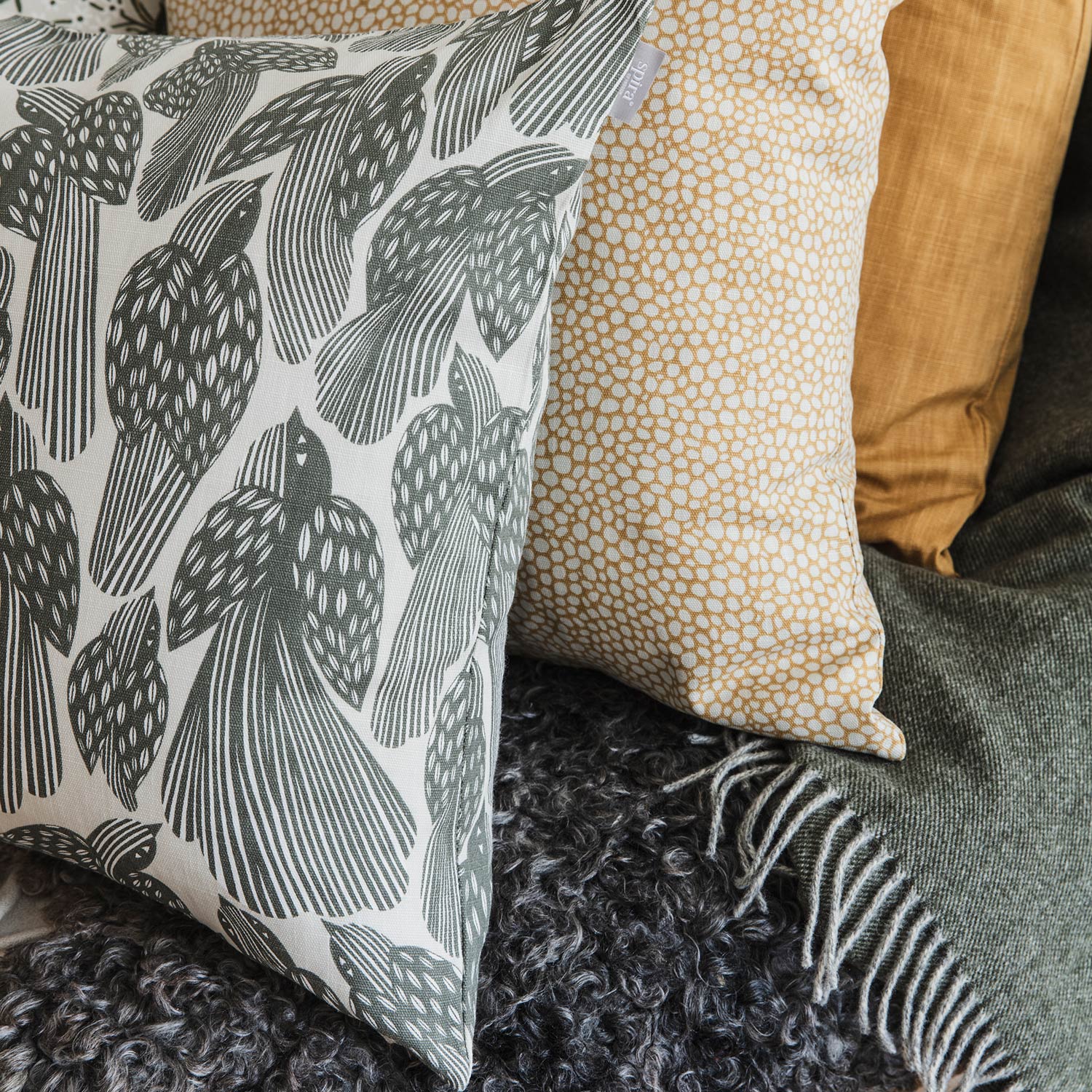 Mix and match the Birds cushion with Spira's coordinating Stripe and mineral green Veck cushion, to name just two of Spira's complementary Scandinavian designs.