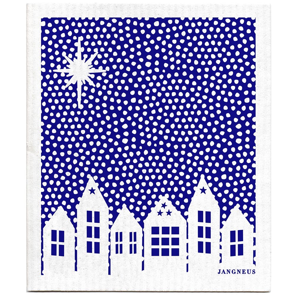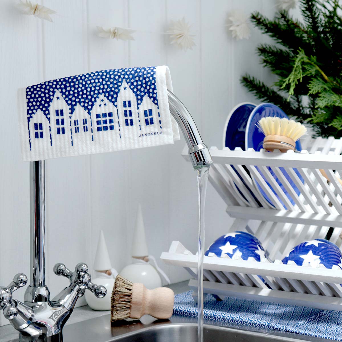 Say goodbye to the mundane J cloth in your kitchen and bring a touch of festivity to your sink with the Jangneus Blue Snow Village cellulose dishcloth.