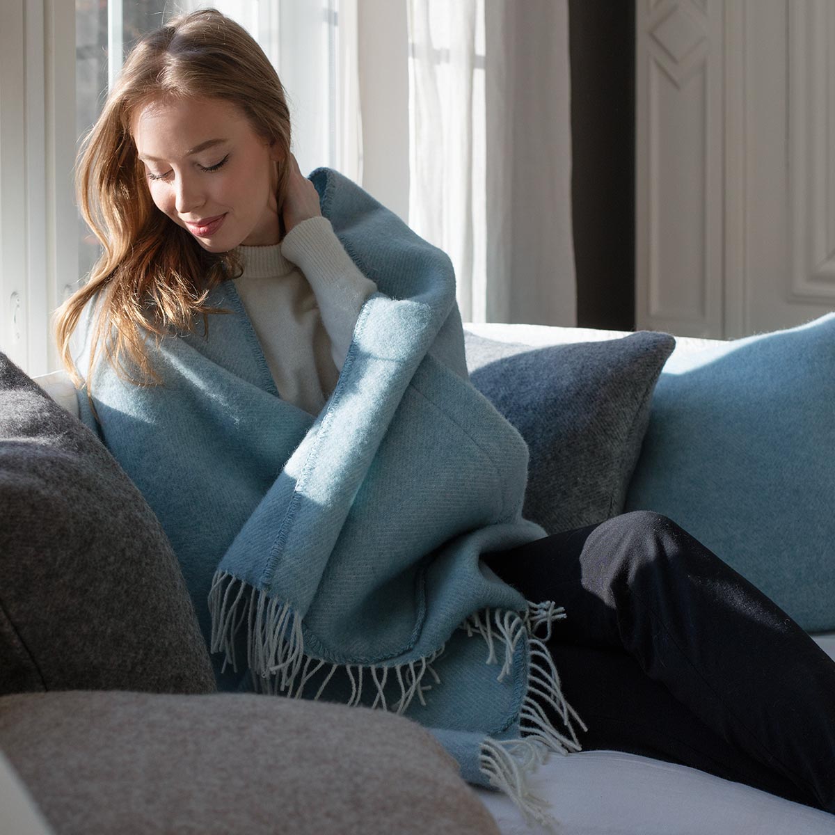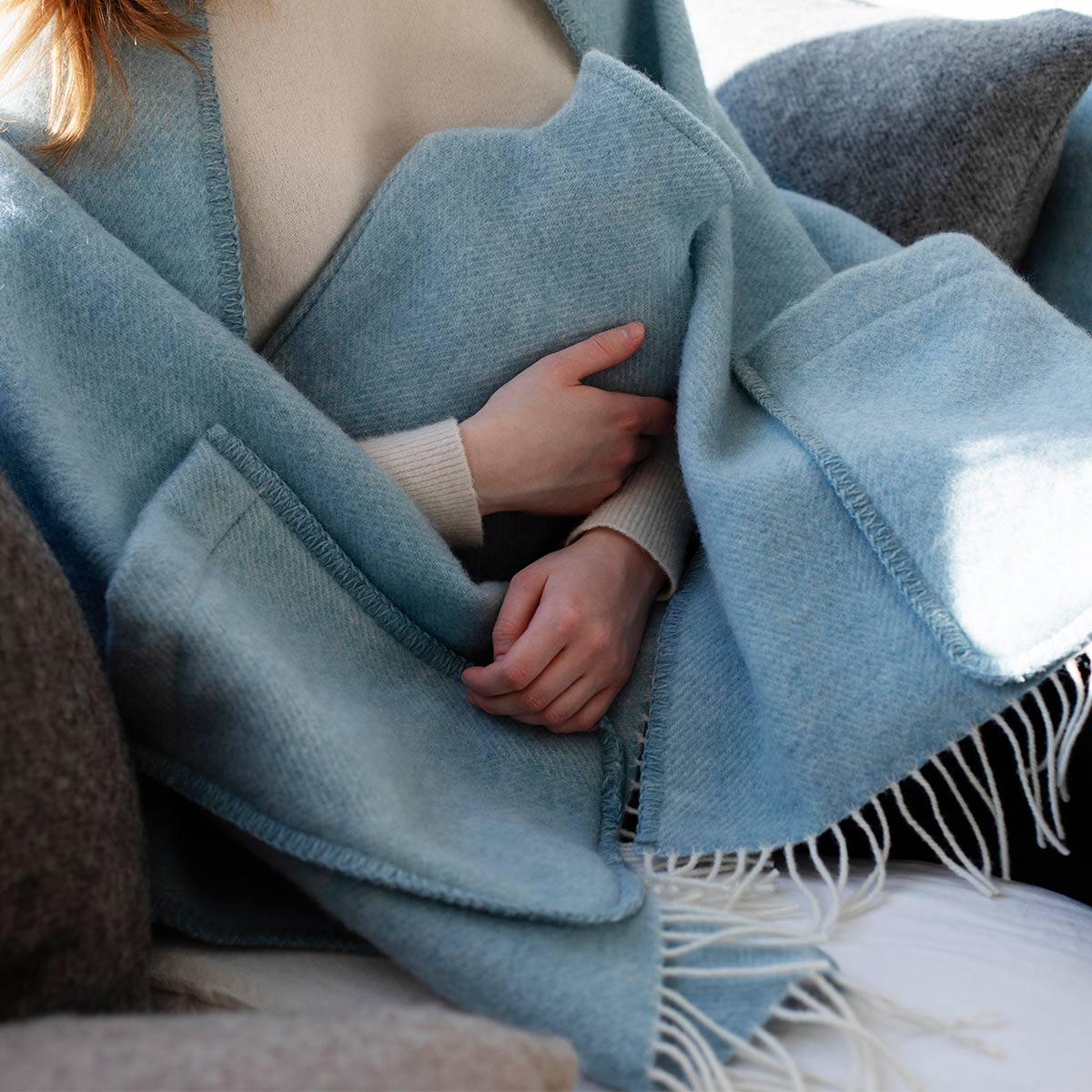 When there’s a chill in the air, Lapuan Kankurit’s Arvo pocket shawl in a beautiful shade of pale blue brings effortless warmth and timeless comfort.