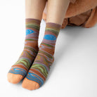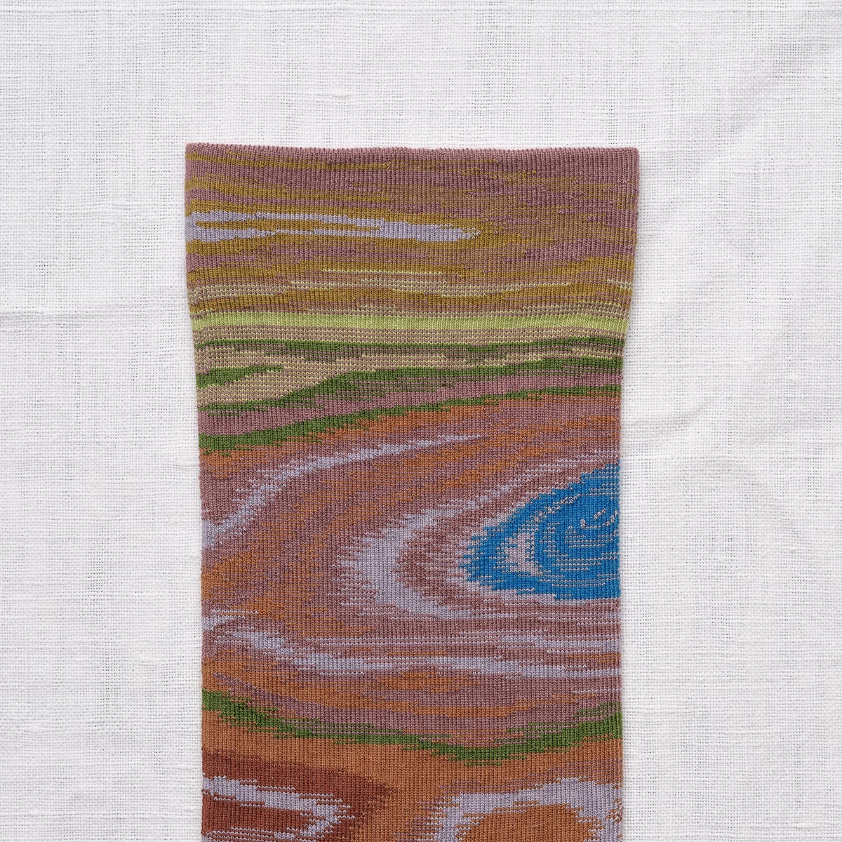 Dive into a world of rippling beauty with Bonne Maison's Caramel Camouflage socks. This unique design isn't about hiding; it's about standing out with subtle, artistic charm. The beautiful caramel-toned patterns swirl like ripples in a warm pool, adding a touch of sophisticated fun to your step.