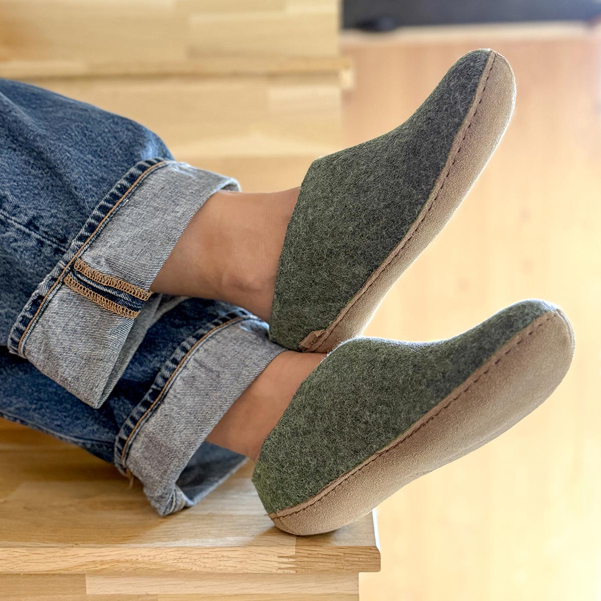 The moss Glerups mule is the perfect slip-on slipper, quick and easy to get on and off, and ideal for year round wear. They are by far the most stylish and understated slippers we've ever had the pleasure to pad around in.