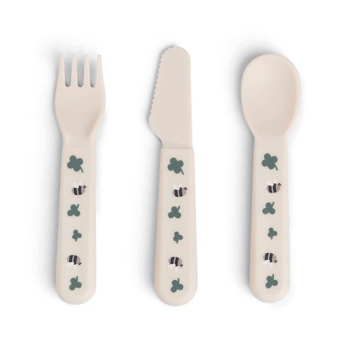 In soft sand and decorated with tiny clover leaves and busy bees, the silky matte cutlery brightens up any meal. When it's time for a new adventure, simply recycle the set as plastic and give it a second life.