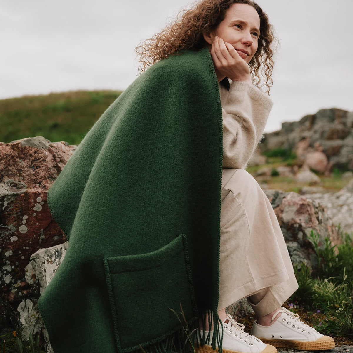 When there’s a crisp chill in the air and your central heating isn’t quite enough, Lapuan Kankurit’s Uni pocket shawl in dark moss green brings effortless warmth and timeless comfort.