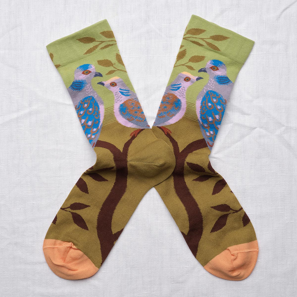 Bonne Maison’s Absinthe Dove socks capture a moment of quiet beauty. Two graceful turtle doves rest on a branch, their soft forms set against a fresh absinthe-green backdrop. Poetic and uplifting, this design brings a touch of serenity and charm to your everyday style.