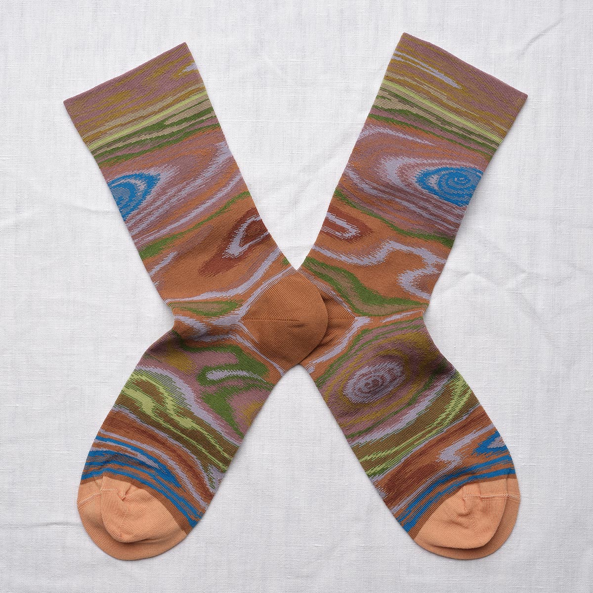 Dive into a world of rippling beauty with Bonne Maison's Caramel Camouflage socks. This unique design isn't about hiding; it's about standing out with subtle, artistic charm. The beautiful caramel-toned patterns swirl like ripples in a warm pool, adding a touch of sophisticated fun to your step.