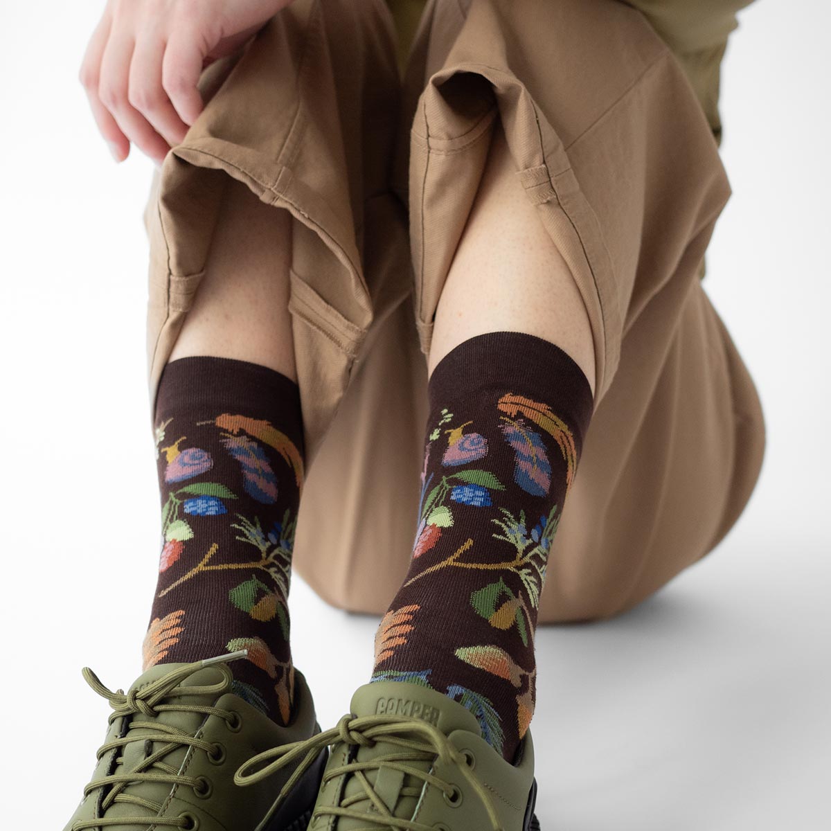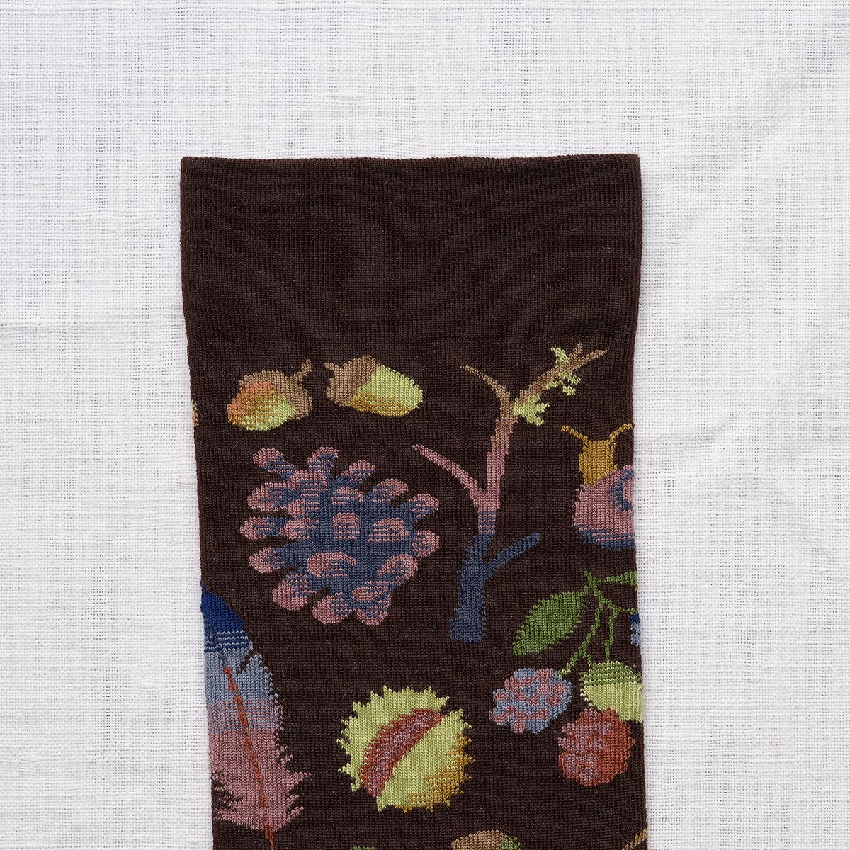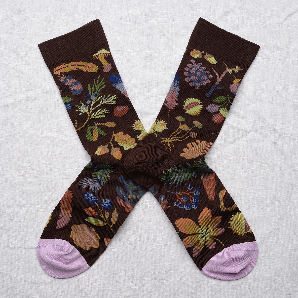 Imagine a walk through autumn woodland, and you've found the inspiration for Bonne Maison's Dark Brown Sprinkled socks. This delightful design is a treasure trove of woodland wonders, featuring plump conkers, little acorns, charming fungi, and delicate foliage scattered across a rich, dark brown background. It's the perfect way to bring the magic of the woods to your feet.