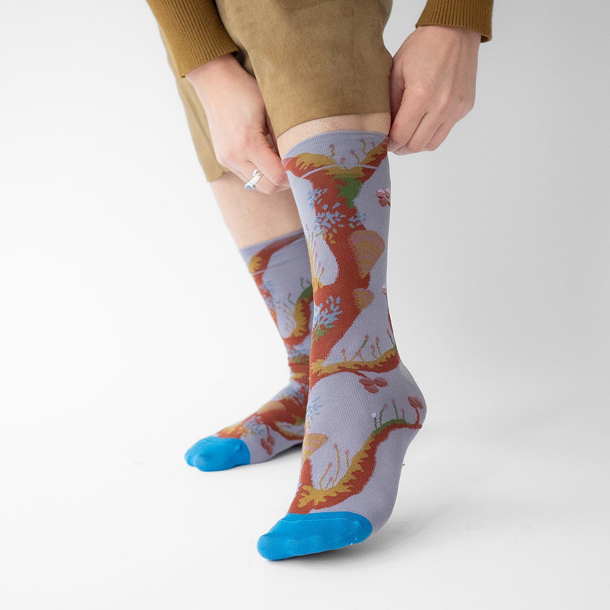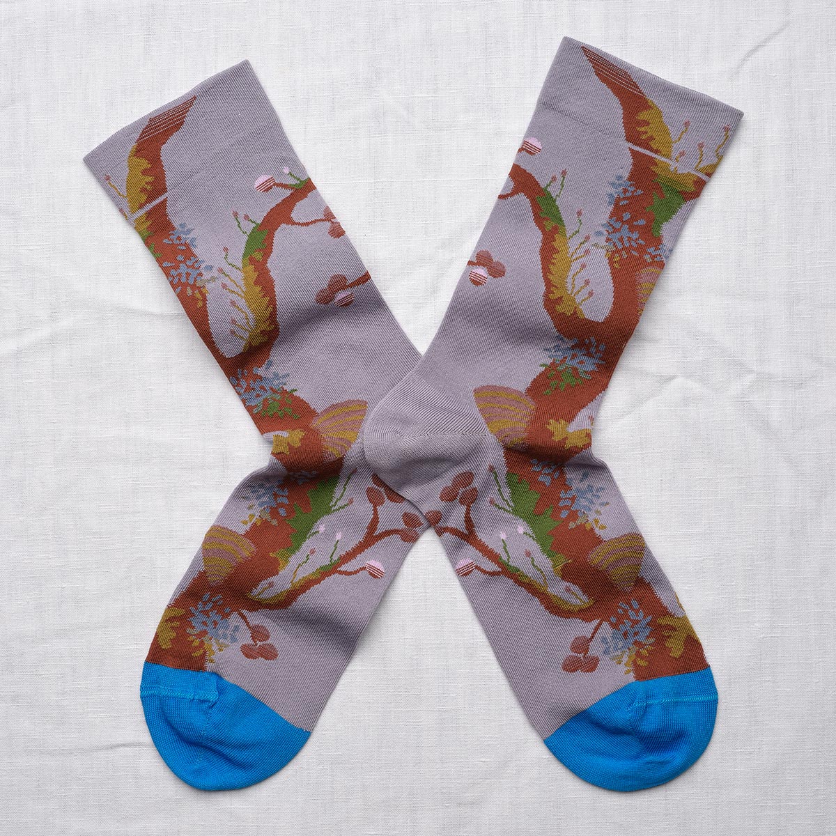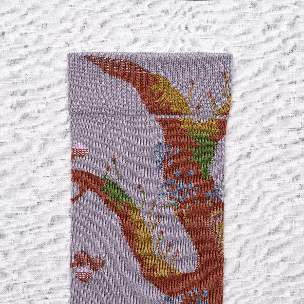 Discover the beauty of nature's quiet details with Bonne Maison's Grey-Mauve Tree socks. This unique design features a striking branch, artfully adorned with bracket fungi and delicate foliage, all set against a beautiful grey-mauve backdrop.