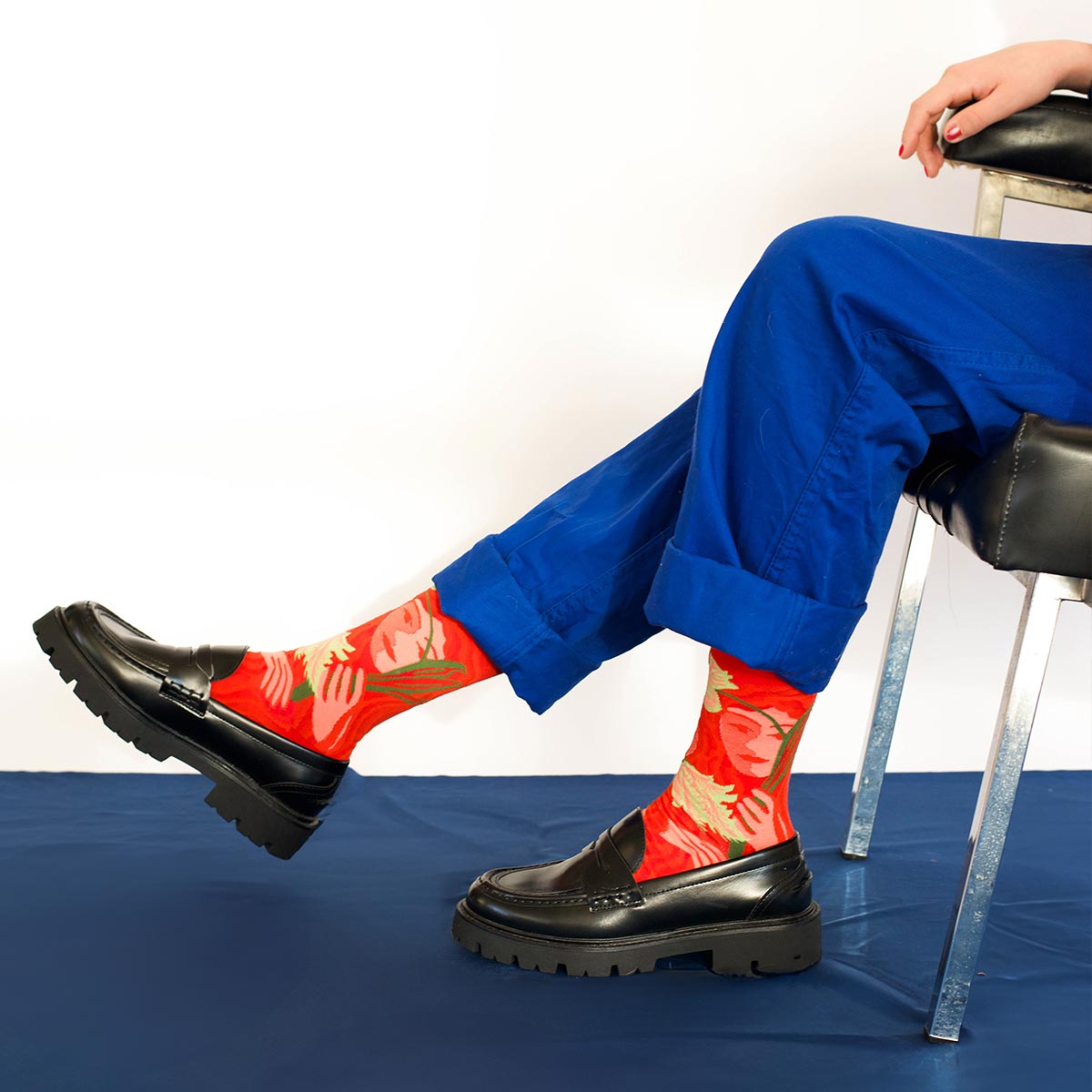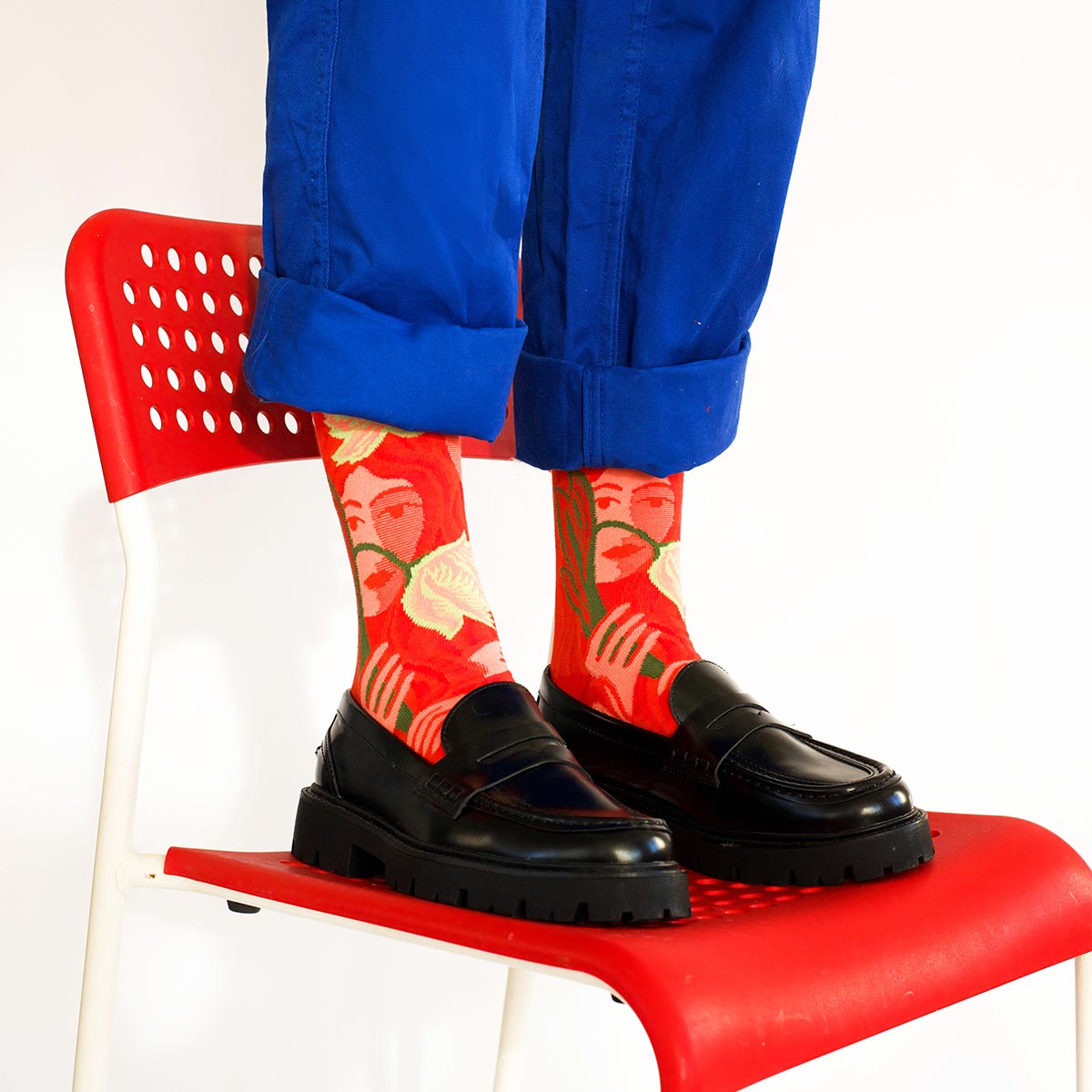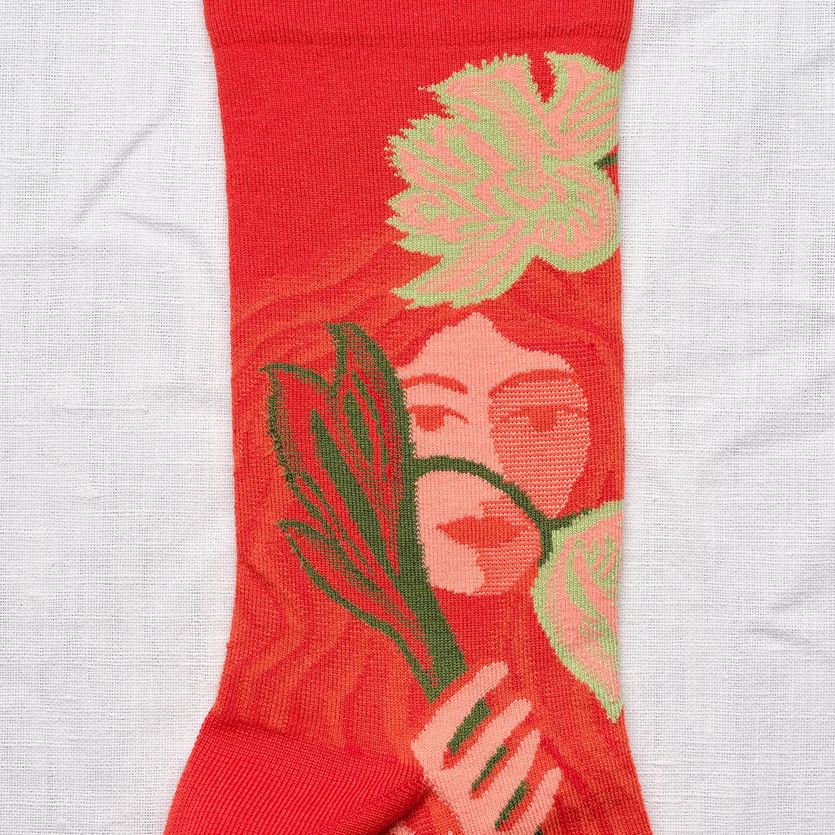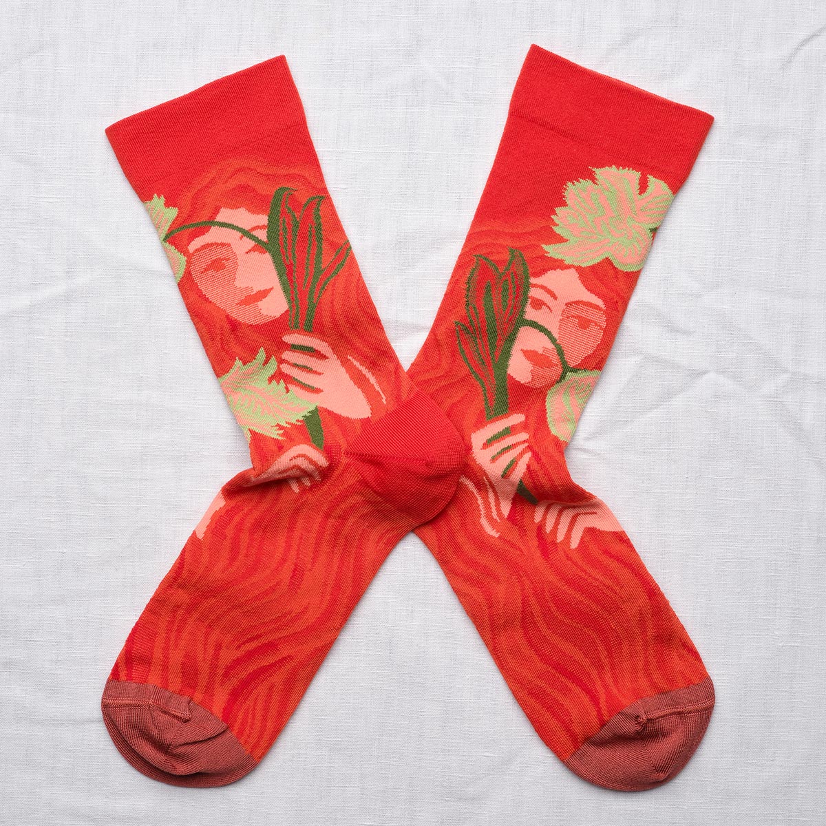 Bonne Maison’s Red Face socks make a bold statement with their vibrant crimson backdrop and striking motif of a serene female face framed by foliage. Artistic yet wearable, this design turns a classic accessory into a conversation piece.