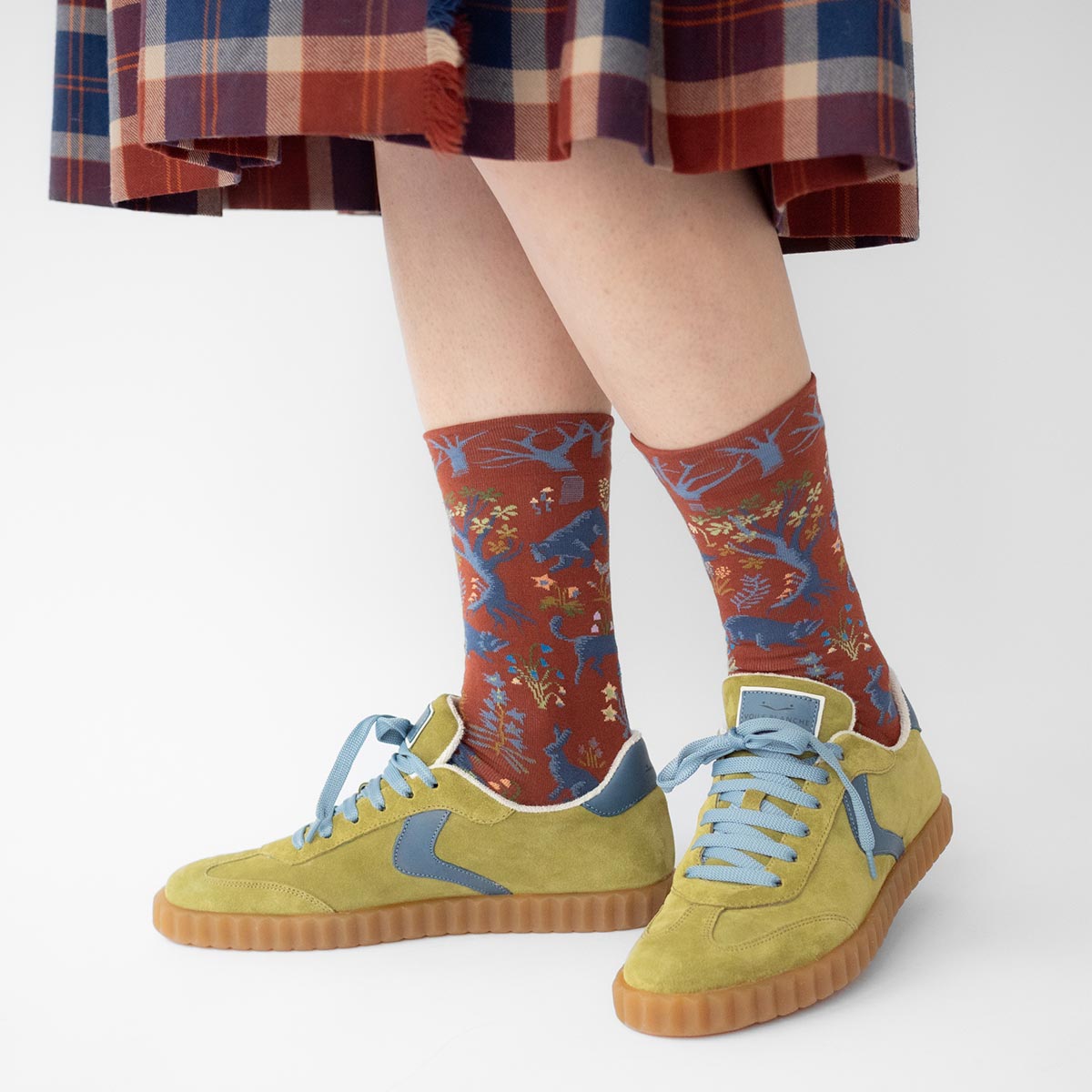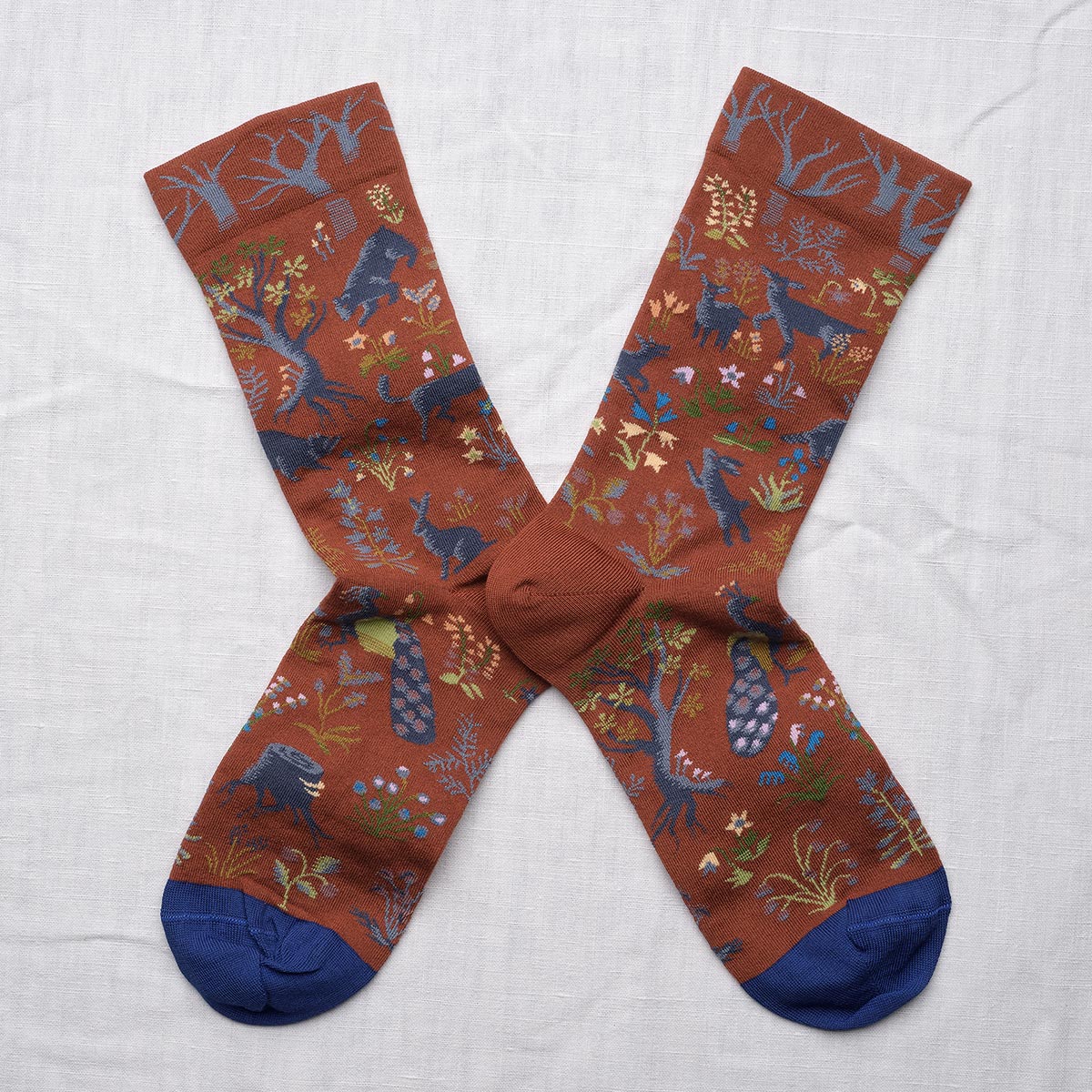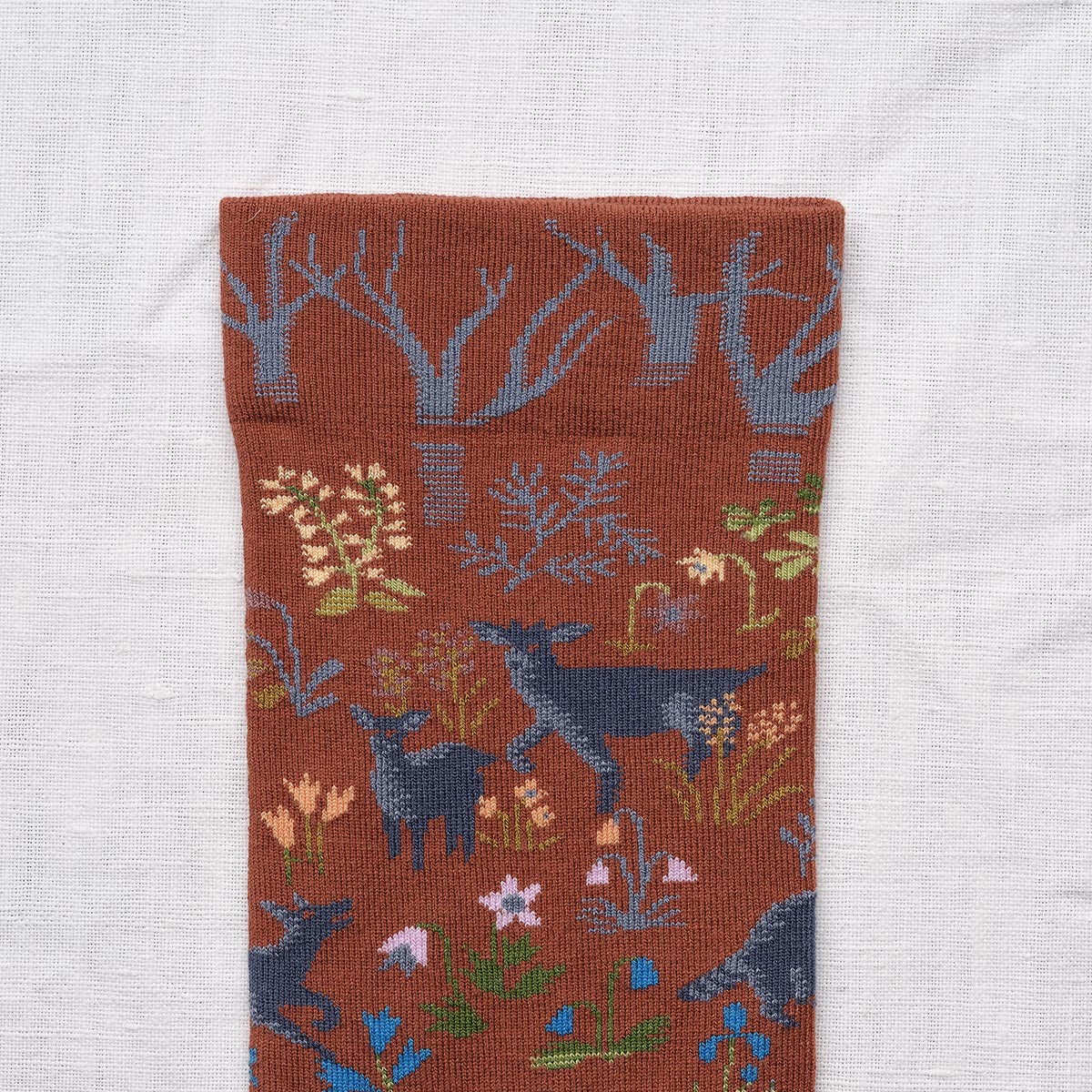 Step into a tiny, enchanted forest with Bonne Maison's Sepia Woodland socks. This charming pair features a whimsical cast of woodland animals, all nestled amongst the trees in a beautifully toned sepia palette. It's a delightful journey for your feet that adds a touch of playful charm to your style.