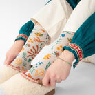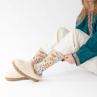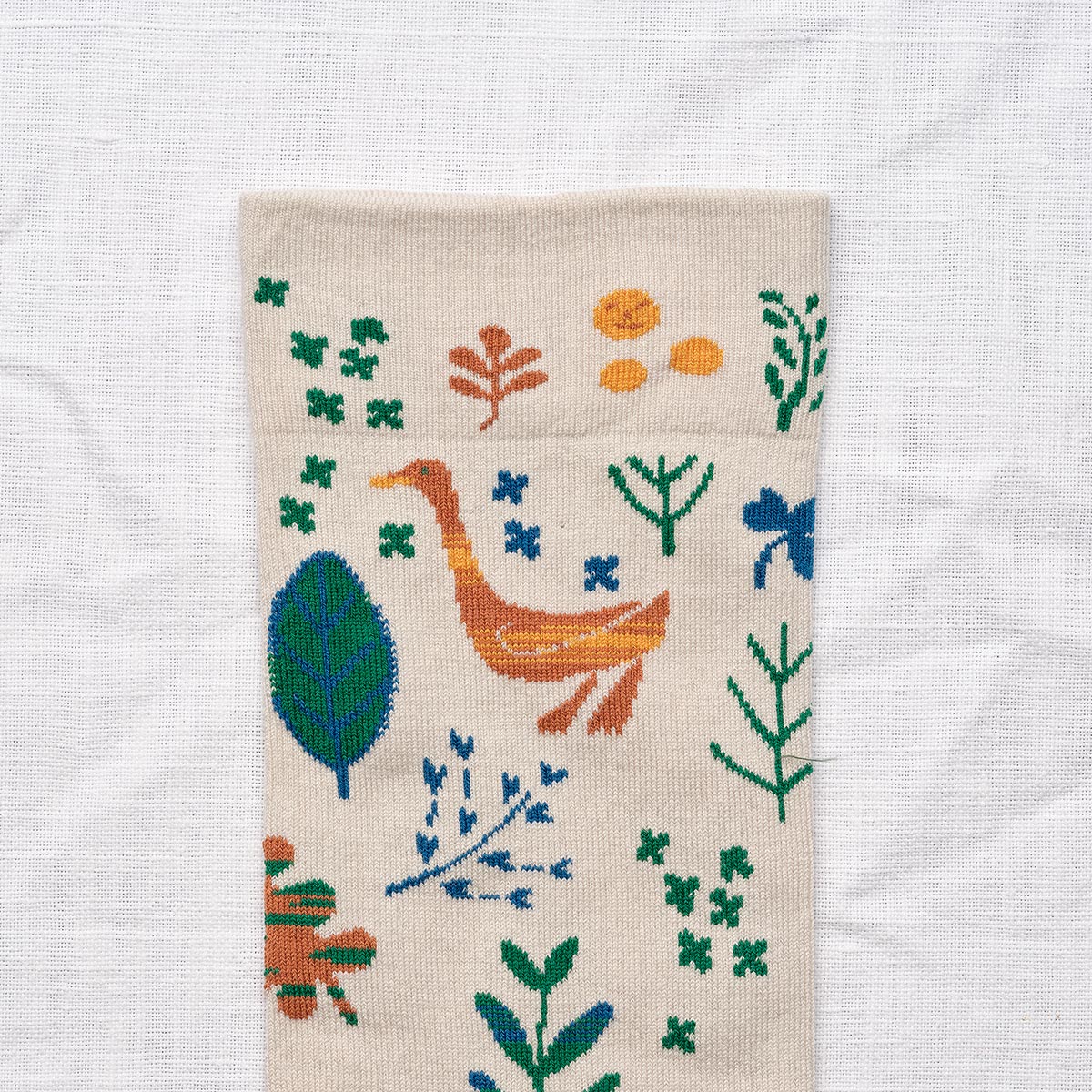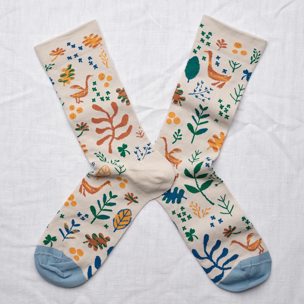 Step into a whimsical landscape with the Bonne Maison Sowing Seed socks. A playful pattern of geese, leaves, and abstract seeds scatters across a cream background, creating a truly unique design.