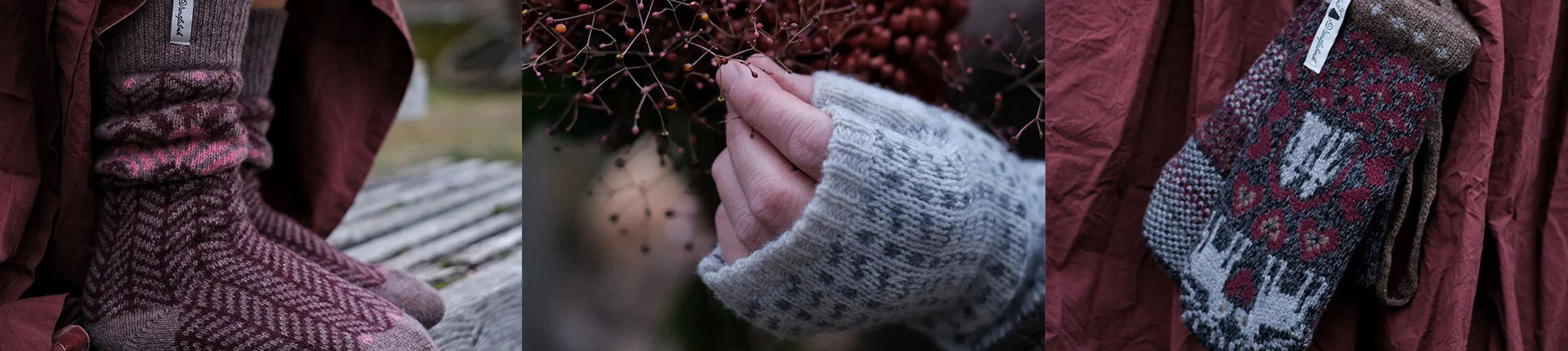 Designed by Åse and Ted Öjbro, these irresistibly cosy socks are knitted in Sweden using traditional patterns and colours. The Fager Iselin design, featuring the fair lily motif in bordeaux & pink, pays homage to the women who once hand-embroidered their mittens with delicate floral details.